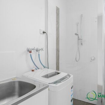 BATHROOM / LAUNDRY – Shower with Glass Screen, Stainless mixer with Hand Held Shower Rose, Toilet, Ceramic Basin, Stainless Mixer, Vanity with Stone Top, Storage Cupboard, Laundry Trough, Washer Bay, LED Lighting