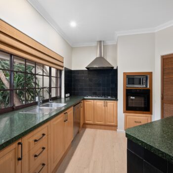 KITCHEN – Open plan to living area, pantry, stainless steel appliances, brand new electric fan forced oven, brand new gas burner cooktop, tiled splash back, rangehood, microwave recess, double sink, mixer tap, double fridge bay, stone top benches with plenty of bench space, dishwasher, great storage with abundance of cupboards, plenty of power points, blinds, roller shutters, water filter, breakfast bar