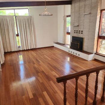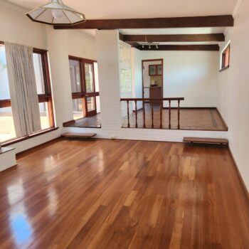 – Formal dining area adjacent to a sunken front lounge featuring wooden floorboards, high raked ceilings, and leafy outlooks toward Trigg Bushland Reserve
